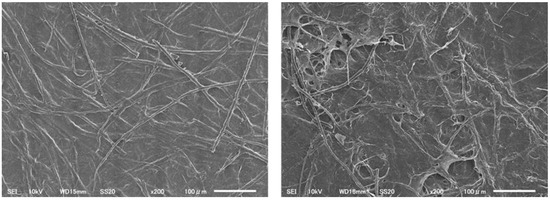 First, the authors prepared a laminated material by combining an untreated CNF sheet and a CAB matrix. However, it was found that some of the specimens delaminated at the interface between CAB and the CNF sheet at the stage of cutting the specimens using a sample punching machine. CNF sheets are known to have a high density in the normal fabrication process. Therefore, when manufacturing a laminate material with a polymer matrix, the polymer is not impregnated. The technique of using highly porous CNF sheets by treating them with acetone is often used. In this study, CNF sheets were also prepared using the acetone treatment method (see Section 2). Table 1 shows the measured density and porosity of untreated CNF and A-CNF. A-CNF sheet shows lower density and higher porosity compared with the untreated one. The difference in the surface condition of the A-CNF sheet and the CNF sheet without acetone treatment was observed by SEM. Figure 2 highlights the results of SEM observation. The untreated CNF sheet was densely packed with fibers, and no pores could be seen from the SEM image. On the other hand, the A-CNF sheet was found to be more porous, with pores the size of several tens of microns. Moreover, since commercial bamboo CNFs are low defibrillated, both nano and microfibers can be observed. Jonoobi et al. [20] reported that the CNF nanofiber network prepared with acetone is open and porous and the measured porosity was 67%. Furthermore, in this study, we used A-CNF for the preparation of laminated material.