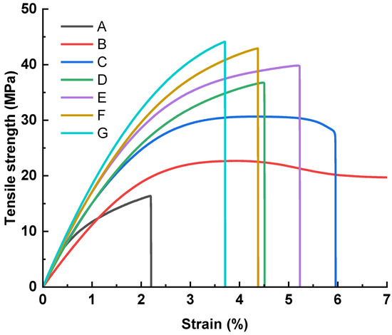 Figure 3. Tensile strength–strain behavior of laminated CAB/CNF with different amounts of cross-linker D376N. Samples: (A) A-CNF; (B) CAB500-5; (C) CAB/A-CNF/D376N (0 wt%); (D) CAB/A-CNF/D376N (3.9 wt%); (E) CAB/A-CNF/D376N (7.7 wt%); (F) CAB/A-CNF/D376N (14.3 wt%); (G) CAB/A-CNF/D376N (24.5 wt%).