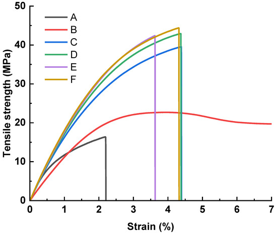 Figure 4. Tensile strength–strain behavior of laminated CAB/CNF/D376N for different hot-press time. Samples: (A) A-CNF; (B) CAB500-5; (C) CAB/A-CNF/D376N 5 min; (D) CAB/A-CNF/D376N 15 min; (E) CAB/A-CNF/D376N 25 min; (F) CAB/A-CNF/D376N 35 min.