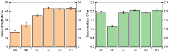 Figure 5. Tensile strength (left) and elastic modulus (right) results of laminated CAB/A-CNF/ D376N for different hot-press pressure. Samples: (A) A-CNF; (B) CAB500-5; (C) CAB/A-CNF/D376N 0 kN; (D) CAB/A-CNF/D376N 10 kN; (E) CAB/A-CNF/D376N 20 kN; (F) CAB/A-CNF/D376N 40 kN.