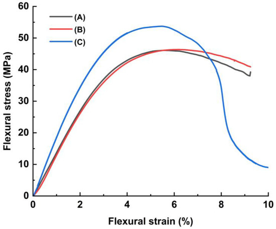 Figure 6. Flexural stress—strain behavior of laminates. Samples: (A) CAB; (B) CAB/A-CNF; (C) CAB/A-CNF/D376N.
