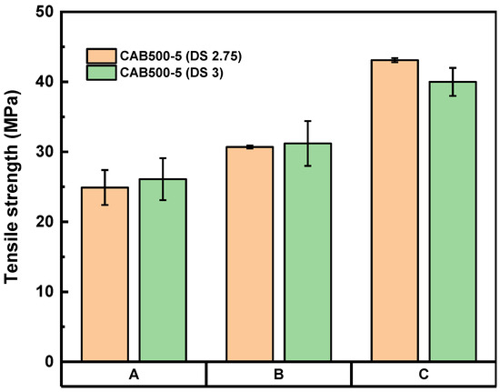 Figure 8. Results of tensile test of laminated material with and without hydroxyl group of CAB. Samples: (A) CAB; (B) CAB/A-CNF; (C) CAB/A-CNF/D376N (14.3 wt%).