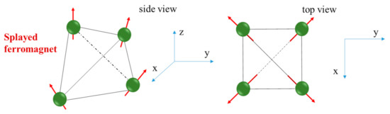 The arrangement of the spins of the Yb3+ ions allows for magnetic frustrated states. In accordance with the conclusions of the works [9,10,11], all four spins are directed outside the tetrahedron, in contrast to the direction of spins that are characteristic of frustrated pyrochlores—two inside the tetrahedron, two outside.