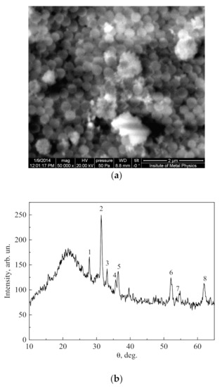 (a) Structure of the nanocomposite with the Yb2Ti2O7 titanate particles, obtained by using a Quanta-200 scanning electron microscope at an accelerating voltage of 20 kV and a magnification of ×50,000; (b) X-ray diffraction pattern of the nanocomposite with the Yb2Ti2O7 titanate particles.
