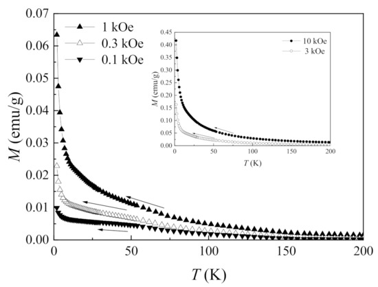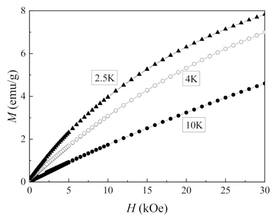 Figure 4 shows the temperature dependences of the magnetization for the nanocomposite sample, measured in fields of different strengths. These dependences are analyzed in order to determine the Curie–Weiss temperature, as well as to find the correspondence of the temperature dependences to the Curie–Weiss law. For this purpose, the temperature dependences of the inverse magnetic susceptibility are plotted. These dependences for the nanocomposite are shown in Figure 5a,b.