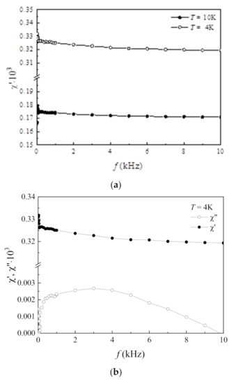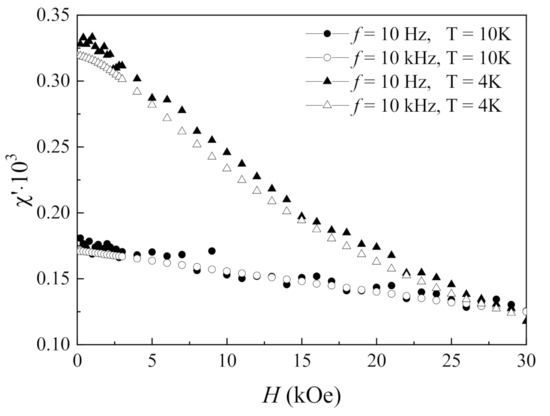 In addition to the frequency dependences, the magnetic field dependences of the AC susceptibility were measured. The measurement results at the frequencies of 10 Hz and 10 kHz at the temperatures 4 and 10 K are shown in Figure 8. While increasing the magnetic field strength, χ′ is seen to decrease.