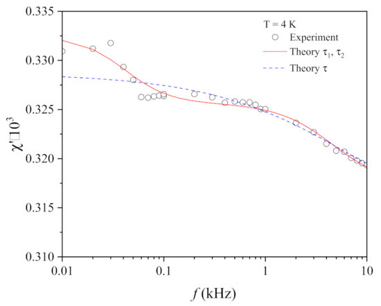 The measurement results of the frequency dependence of the AC susceptibility shown in Figure 6 are approximated using Formula (1). This procedure is the least mean square data fitting by varying the parameter sets , , , and , when K equals 1 or 2. The results of the fitting are given in Figure 9. The two-relaxation-times model describes the experimental data more exactly than the one-relaxation-time model.