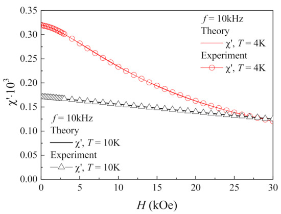 In [22], Formulas (3) and (4) are found to describe a field dependence of the real part of the AC susceptibility of several nanocomposite rare-earth titanates—in particular, those with Gd2Ti2O7, Yb2Ti2O7, Dy2Ti2O7, Dy2TiSiO7, Er2Ti2O7, and Sm2Ti2O7 particles. In [22], composites with Gd2Ti2O7, Dy2Ti2O7, and Dy2TiSiO7 particles are studied in most detail. In this work, an approximation by Formula (2) for the nanocomposite with Yb2Ti2O7 particles will be performed. Let us consider the experimental results for the frequency of f = 10 kHz, shown in Figure 8. Figure 11 shows their approximation by Formula (3). The approximated dependences are seen to match exactly with the experimental data. At the temperature T = 4 K, the value of the field Hr turned out to be 17 kOe, and at the temperature T = 10 K, Hr = 64 kOe. The trend of increasing the characteristic field Hr while increasing the temperature, noted in [22], is confirmed in our study of the nanocomposite with the Yb2Ti2O7 particles.