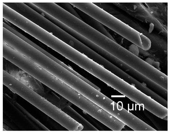 SEM of ‘as received’ manufacturing scrap material showing limited resin wet-out on glass fibers. This indicates the as-received material had very high fiber content, >70 wt%.