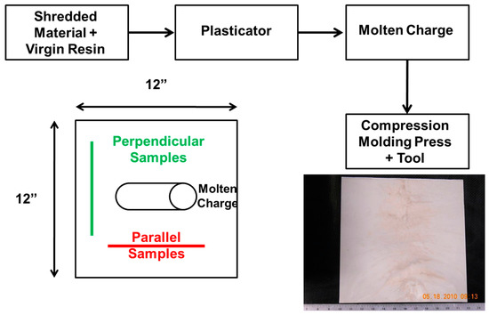 Processing of recyclate, as-received and simple blended recyclate with virgin PP via ECM. Specimens were cut in two directions—Longitudinal and Transverse, respectively, to capture the influence of flow induced fiber orientation. Fibers are preferentially oriented in the Longitudinal direction and cross-oriented in the Transverse direction. The plate is 300 mm × 300 mm (12″ × 12″).