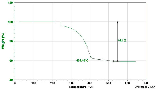 TGA curve of as-received PP-GF recyclate. The actual data begins at 98 wt% since there was some loss of data in the 100–98 wt% region.