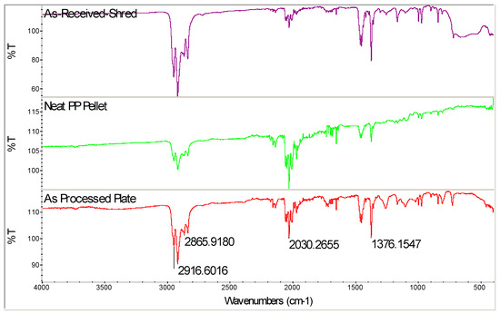FTIR traces of the PP-GF shred, neat PP pellet and as-processed plate. There is no material degradation as evidenced by these tests.