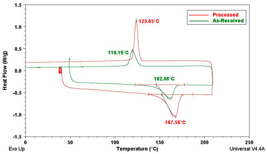 Heating and cooling DSC curves for the as-received shred and processed plates.
