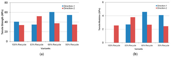 Figure 8a,b summarize the tensile strength and modulus of the various recycled materials. It is seen that the strength and modulus are higher for the 66% recycled content (40% Wf) specimens, compared with the lower and higher percentages of recycled content. This indicates optimal wet-out of the fiber interface at this percent. Table 3 summarizes the tensile test data.