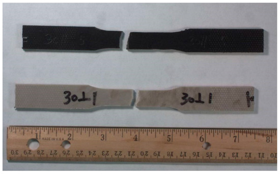 The fiber distribution in the part has a definite influence on the resulting mechanical properties. The specimens measured in ‘Longitudinal’ exhibited higher value compared with ‘Transverse’ specimens. The ‘Longitudinal’ specimens had fibers oriented primarily in the direction of the loading; and the ‘Transverse’ samples had fibers ‘Transverse’ to the loading direction. The dashed line in Figure 8a,b points to the lower and upper bound of comparable 30 wt% virgin LFT specimens. It was seen that the strength is comparable for the 50% and 66% recycled content specimens. Figure 9 illustrates a typical tensile failure of the 66% recycled PP-GF compared with a PP-GF LFT specimen. The failure was through a localized fracture in tension and a similar failure was exhibited for both the recycled PP-GF and the LFT PP-GF of similar weight fractions.
