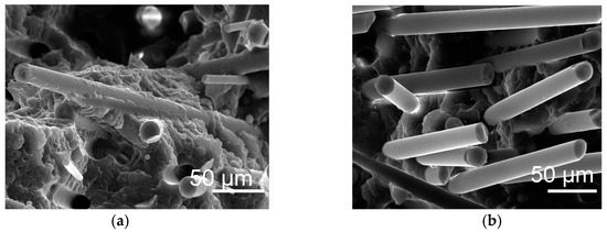 Figure 10a,b illustrates the wet out of the tensile specimens. The higher recycled content material (Figure 10b) was seen to have lesser fiber-matrix wet-out as compared with the specimens where some amount of virgin polymer was blended (Figure 10a). The fiber-matrix interface for the 66% specimens in Figure 10a illustrates the tortuosity of crack propagation due to the excellent fiber-matrix wet-out. This suggests that for tensile performance, a small amount of virgin polymer blended with recycled PP-GF improves the material response, comparable to 100% PP-GF recyclate.