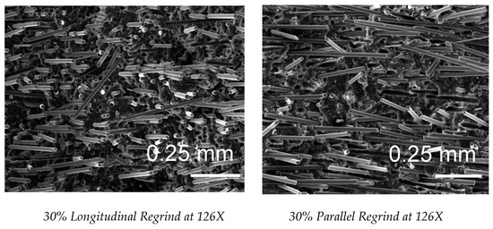 Figure 11 illustrates the effect of fiber orientation for 30 Wf%, i.e., here 30% Wf corresponds to 50% recyclate. The microstructure illustrates that 30% ‘Longitudinal’ recyclate sample has more fiber aligned in the loading direction and fibers aligned out of plane from the screen and the 30% ‘Transverse’ samples have fibers aligned in-plane to the screen. This provides evidence of higher properties for the ‘Longitudinal’ specimens.