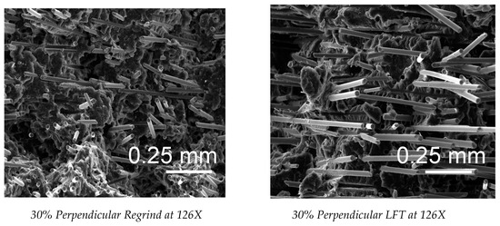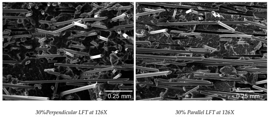Figure 13 illustrates 30% ‘Longitudinal’ LFT sample indicating more fibers aligned in the loading direction compared with 30% parallel LFT sample.
