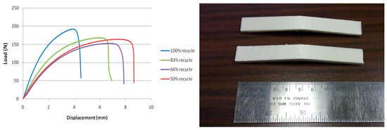 Flexural tests were conducted per ASTM D790 in a three-point bend mode. Table 4 summarizes the flexural test results. Figure 14 (Left) illustrates the load-displacement curves for various recycled contents. For higher recycled contents, i.e., the 83% and 100% recycled content, the specimens are stiffer in flexure; for example, in the 50% and 60% recycled content, the curves are gradually softening, i.e., they possess higher ductility. There was no catastrophic failure in any of the specimens evaluated. The specimens deformed gradually as seen in Figure 14 (Right).