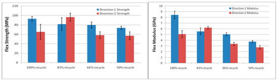 Summary of flexure tests for various recycled fiber contents for ‘Longitudinal’ and ‘Transverse’, respectively.