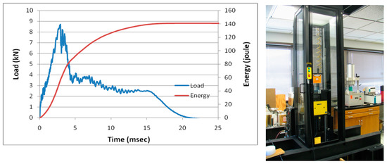 The impact response of these panels was evaluated by subjecting them to a drop weight low velocity impact (LVI) with an impactor of 6 kg mass to impart 6 J and 24 J impact energies, respectively, under different drop heights. A typical load-time and energy-time curve is shown in Figure 16 (left). Samples with dimensions of 100 × 100 mm (4″ × 4″) were prepared for impact testing. The setup shown in Figure 16 (right) was used to conduct the LVI tests. A 19 mm (3/4″) hemispherical-shaped impactor was used. Specimens (plates) were clamped between two metal plates in a fixture with 75 mm (3″) diameter opening at its center. The impact took place in the exposed circular area. The load versus time and energy versus time were recorded.