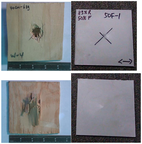 LVI response of plywood (left) compared with an 83% recycled content PP-GF (right) impacted at 24 J impact. The top row is the strike face; the bottom row is the back face.