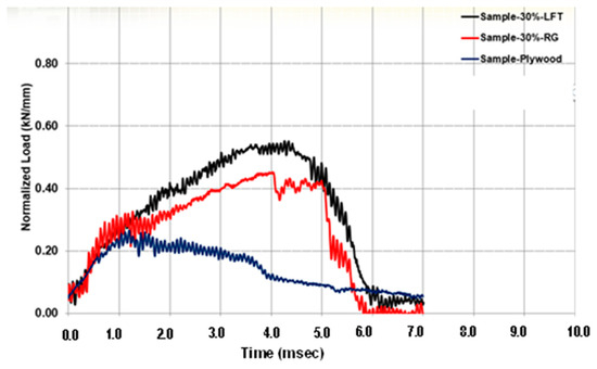 Figure 20 provides a comparison of load–time curves for the LVI response of recycled PP-GF, plywood, and 30 wt% LFT PP-GF. It can be noted that the PP-GF recycled plate was almost equivalent to the response of LFT virgin, the highest performing. Plywood absorbed the least amount of energy.