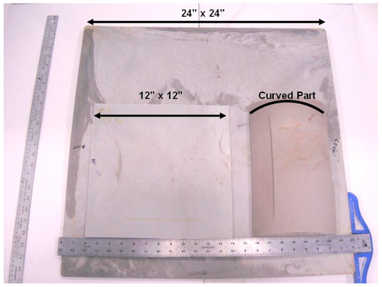 Scale up and shape illustration. PP-GF panels of various sizes and shapes produced from scrap/recycled materials. Demonstration of ability to scale-up the process into panels and curved shapes for parts The large plate is 600 mm × 600 mm (24″ × 24″) and the small plate is 300 mm × 300 mm (12″ × 12″) in dimension.