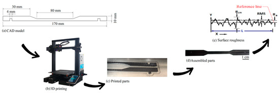 The use of 3D-printed parts has become common in many scientific disciplines due to the unique properties of this technology [1,2,3,4,5]. High ability and flexibility in printing samples using this method are high, and 3D printers can make complex geometric models according to the type of filament and composite used in printing samples relatively faster than many methods [6]. Moreover, poly-lactic acid (PLA) is used in many applications because of the ester linkages that connect the monomer units; PLA is classed as an aliphatic polyester and is used in a variety of biomedical applications: Suture threads, bone fixation screws, and medication delivery devices are only a few examples [7,8]. Three-dimensional printers can print different materials, including polymers and various metals, and considering the CAD model, sampling can be performed with this method in many shapes and models [9]. So far, multiple materials have been used to make prototypes using the 3D-printer method [10], including the use of these materials in industry, medicine, art, sports, and fashion [11,12,13,14,15]. Leite et al. [16] investigated the fabrication of 3D-printed specimens in which the parts were made of PLA, and the mechanical properties were evaluated. Camargo et al. [17] investigated the 3D printing process by using the Fused Filament Fabrication (FDM) method. This study aimed to determine the relationship between printed samples’ time, weight, and mechanical properties. Although many advances have been made in 3D printing so far, shortcomings such as defects in the printing of complex shapes, the use of various materials in the printing of samples, and the study of the coherence of the making of pieces can be seen [18,19]. Therefore, there is a need for studies on the effect of different parameters of printers on other materials and to show the relationship between these parameters more clearly. For this purpose, adhesion properties were investigated by Sanatgar et al. [20] in the FDM process, using PLA. In this experiment, the effects of IP and ET significantly impacted the degree of adhesion. The investigation of properties such as tensile strength, adhesion, wettability, roughness, etc., leads to knowing the characteristics of this printing process, and this information can be used in various other applications [21]. Moreover, optimizing the 3D printing process to reduce the number of experiments and increase the efficiency of this process has been investigated [22]. In the optimization, the printer’s IP, ET, and other input parameters can be evaluated according to the output intervals [23], and this is effective in the 3D printing process, helps reduce waste, and saves the environment [24]. In addition to advances in 3D printing methods, efforts to increase mechanical properties such as tensile strength are still ongoing; for example, Xia et al. [25] were able to achieve a 30 MPa design by creating a design model. Heidari et al. [26] investigated the bending properties in the 3D printing process of composite parts, using PLA. The effect of viscosity in the 3D printing process was investigated by Beltran et al. [27]. This study observed that with increasing and decreasing ET, the viscosity in PLA filament would change significantly, leading to changes in the mechanical properties of printed samples. Hanon et al. [28] were able to evaluate FDM-printed PLA components in optimized materials up to 57 MPa strength. Afonso et al. [29] designed a model to predict the mechanical properties of parts printed by FDM, using PLA filament, which was significantly consistent with the experimental results. Furthermore, the use of the DOE method in FDM optimization to produce FDM-integrated components has been evaluated in which the input parameters of the printer have been optimized by the RSM method according to the output parameters [30,31,32,33].