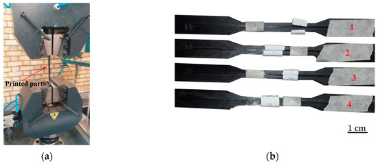 After assembling the samples, the specimens were evaluated for FL by a Santam STM-20 machine. Figure 4a shows that the clamp of the tensile device fixed the printed part, and Figure 4b depicts the samples after the tensile test.