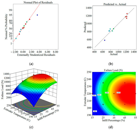 Figure 6a shows the overview of the normal plot of residuals which can understand the percentage of design error is shallow. Figure 6b shows the predicted with actual output degree of conformity of the test output results, as was evaluated according to the predicted and actual values. Since the number of output data in all graphs was close to the mile line, it can be concluded that the experiments were significantly closer to the actual values. Figure 6c shows the interaction of the two parameters IP and ET on FL. According to Figure 6c, by increasing IP and average value in ET, the samples have more resistance in the tensile test because of the high percentage of IP and the integration of the PLA structure at a temperature of 210 to 230 °C, which leads to a high cohesion, and the structure is formed in the polymer. Eventually, this effect increases the FL of the samples in these printing conditions. Moreover, the contour plot in Figure 6d shows a 2D view of the response surface plot, and it helps to find the proper parameters in the 2D plot (the red area shows the maximum rate of FL).