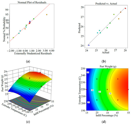 Figure 7 shows the DOE diagrams for SW of 3D printing samples. Figure 7a shows the normal plot of residuals, and the percentage of design error is deficient because all of the analyzed samples are close to the slope. Moreover, Figure 7b depicts the predicted vs. actual output for which the degree of conformity of the test output results was evaluated according to the predicted and actual values. Since the number of output data in all graphs is close to the mile line, it can be concluded that the prediction of the experiments was significantly closer to the actual values. Figure 7c shows the interaction between IP and ET on SW. According to Figure 7c, the samples have more weight by increasing IP and average value in ET because, due to the high percentage of IP and good melting of PLA filament, the samples are formed with a minimum rate of porosity, which leads to an increase in the SW. The contour plot is also shown in Figure 7d, which shows a 2D view of the response surface plot.