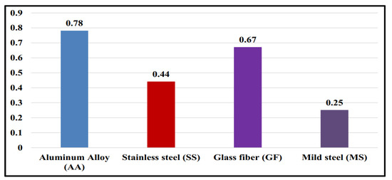 From the above Figure 2, the aluminum alloy, alias aluminum metal matrix, is comparatively better than stainless steel, glass fiber, and mild steel performance-wise, with a rating of 0.79. As shown, it is far better than mild steel (a metal considered very good for engineering applications). This is evidence that AMMCs are sustainable materials for engineering applications, even in wind turbine blade manufacturing (which is an engineering application). Another analysis for comparison is comparing some of the important qualities they possess including durability, corrosion resistance, and densities. Once again, AMMCs dominate the other materials in this category; thus, they are arguably better than mild steel, glass fiber, and even stainless steel [17]. This property is shown in Figure 3.