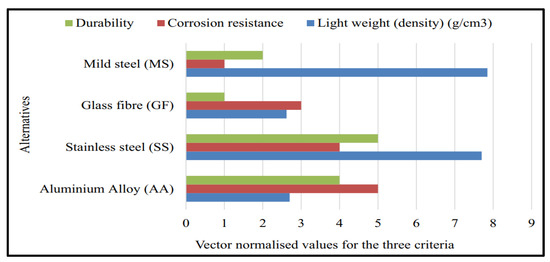 Now, considering wind as a source of energy, the wind turbine, as said earlier, is a significant component. It is critical for the production or manufacture of a wind turbine to use materials that can last a long time, resulting in a higher profit with lower maintenance costs [9]. Metal matrix composites have been proven to offer several advantages over ordinary materials. In other words, all the advantages they offer include flexibility in design, improved productivity, greater tolerance, higher corrosion resistance, and higher durability, which means, excellent heat resistance, lighter weight, better performance, and high stiffness [10]. Moreover, better performance under extreme conditions such as elevated temperatures and better chemical resistance ensures the blade lasts longer. An important consideration in the production of a horizontal axis wind turbine blade for green energy generation is the material choice procedure when considering developing countries such as Nigeria because of the challenges caused by the low wind speed variations [11]. Because wind turbine edges are so complex, the materials used for sharp edge advancement must be machinable, strong, high erosion- and wear-rate safe, of high solidarity to lightweight proportion, and financially prudent. This is the rationale behind exploring studies utilizing different techniques to examine material decisions for planning wind turbine cutting edges [12]. There are different strategies to carrying out the material determination process; be that as it may, this review centres around the multi-criteria design method (MCDM). MCDM is a fantastic tool for dealing with complex issues in design and other fields of life that deal with the issues of [13]. The method aids in segmenting the problem, and the chief investigators use it to identify the problems and suggest workable remedies. AHP, data envelopment analysis approach, entropy technique, TOPSIS, EDAS, FAHP TOPSIS, TOPSIS leveraging Excel, and WASPA are some of the numerous strategies that are included in multi-criteria decision making. It is stable and incredibly simple to use [14,15].
