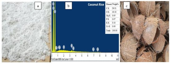 (a) Coconut rice, (b) elemental composition of coconut rice, and (c) coconut shells.