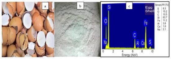 (a) Eggshell, (b) raw and powder, and (c) elemental composition of eggshell.