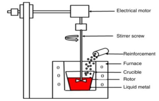 The stir casting method is a renowned method employed to produce metal matrix composites. It involves a homogeneous mechanical mix of the reinforcements, thereby causing a uniform distribution of the matrix and the reinforcements [81]. Kareem et al. [82] made it clear that the stir casting process is primarily employed to produce particulate reinforced metal matrix composite (PAMMC). It was also stated that “it is economical, simple, and the most widely used commercial technique known as the “vortex technique”. According to Hashmi et al. [83], the stir casting method is a popular and cost-effective method for mass-producing metal matrix composites.
