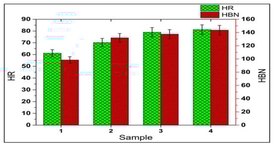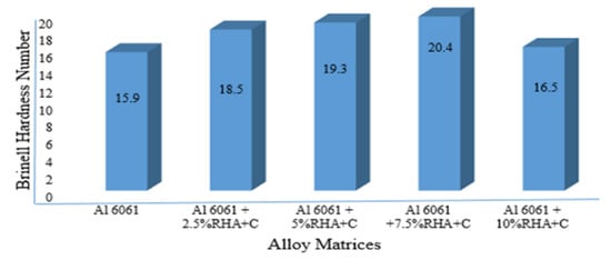 Following the work of Olusesi and Udoye [115], this study demonstrates the possibilities of using agricultural waste materials as reinforcement rather than more conventional synthetic reinforcements such as silicon carbide and boron carbide. For this investigation, clay particles and rice husk ash are used because they have a track record of enhancing composite properties including hardness, tensile strength, and bend resistance. This study demonstrates the viability of agro-waste reinforcement in comparison to synthetic reinforcement through a variety of literature reviews and tests carried out at various reinforcement weight percentages. AA6061/clay + RHA composite was successfully manufactured using the stir casting method with various weight percent reinforcements of 2.5%, 5%, 7.5%, and 10%. Scanning electron microscope (SEM) (photographs demonstrate the composite’s homogeneous dispersion of reinforced particles) and XRD (X-ray diffraction analysis) images illustrate the composite’s occurrence of distinct phases. In terms of hardness properties, the 7.5 wt% reinforcement was superior to other composite weight reinforcements, as shown in Figure 13. According to the results of the SEM/EDS study, the matrix showed a uniform distribution of reinforcement.