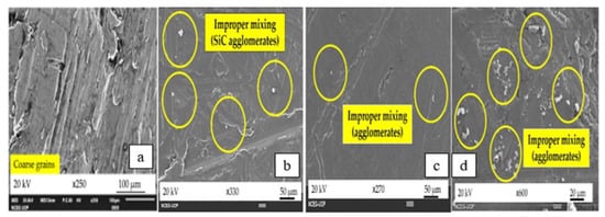 The study of the mechanical properties and the microstructural analysis of the hybrid reinforcement of metal matrix composites using agro-waste and eggshells will be reviewed in this section. Khan et al. [113] carried out a study on the microstructural and mechanical characteristics of a brand-new ternary-reinforced AA7075 hybrid metal matrix composite and compared them. The stir casting liquid metallurgical process was used to create four samples, including AA7075 (base alloy), AA7075–5wt%SiC (MMC), AA7075–5wt%SiC–3wt% rice husk ash (RHA), and AA7075–5wt%SiC–3wt%RHA-1wt% carbonized eggshell (CES). The experimental densities matched the theoretical values, demonstrating that the samples were successfully made. For the n-HMMC, a minimum density of 2714 kg/m3 was noted. Additionally, n-HMMC had the highest porosity, which was found to be 3.11%. Additionally, the novel hybrid metal matrix composite (n-HMMC) demonstrated a 24.4% improvement in ultimate tensile strength and a 32.8% increase in hardness when compared to the basic alloy, as shown in Figure 11. The basic alloy AA7075 contains coarse grains with a minimum amount of porosity, as seen in Figure 12a. Figure 12b,c show some SiC agglomerates in the matrix material, whereas Figure 12d shows that n-HMMC contains a mixture of fine and coarse grains as well as some pores. It is important to note that poor mixing, pouring problems, and trapped gases are the most likely causes of porosity. The main component of CES is CaCO3, which combines with oxygen to produce CO2 gas. Because of the pores left behind, CO2 escapes from the molten mixture and causes foaming. However, it has been found that the distribution of the particles in the matrix is improved when the 3 wt% RHA is added to the MMC to create s-HMMC. This result is in line with the study of Dixit and Suhane [114].