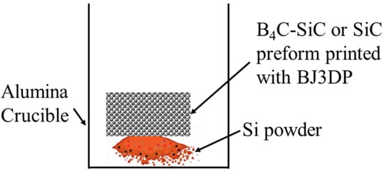 - Oh, J.W.; Park, J.; Nahm, S.; Choi, H. SiC-Si composite part fabrication via SiC powder binder jetting additive manufacturing and molten-Si infiltration. Int. J. Refract. Met. Hard Mater. 2021, 101, 105686. [Google Scholar] [CrossRef]