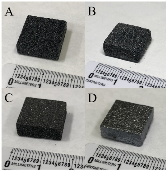 Macro images of (A) as-printed SiC preform, (B) a SiC preform infiltrated with Si, (C) a SiC-B4C preform, and (D) a SiC-B4C preform infiltrated with Si.