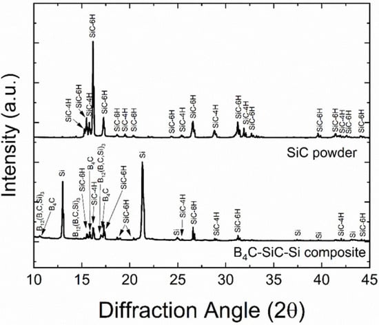 Figure 3 shows the XRD patterns of the SiC powder and the SiC-B4C-Si composite. The powder had two types of alpha-phase SiC polymorphs, 4H and 6H. The results show that the SiC powder is mostly the 6H polytype, and this can vary from different powder sources. When processing the SiC with the B4C addition and silicon melt infiltration, the amount of 4H in the composite decreased, converting to 6H during processing. The composite also consisted of B4C, a ternary phase (B12(B, C, Si)3), and residual free Si. The B4C likely reacted with Si to form this ternary phase.