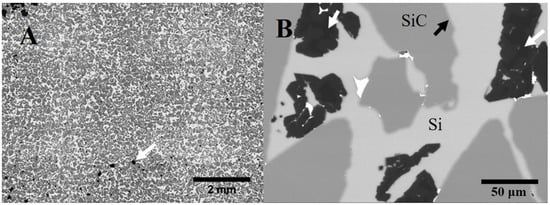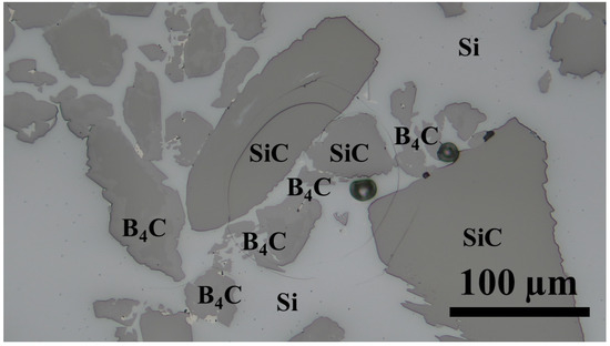 Figure 4A,B show optical and SEM images, respectively, of cross-sections of the processed composite. In the optical image in Figure 4A, the black regions (pointed out with a white arrow) are pores, and the light grey regions are the ceramic particles; the white regions are Si. The density was high because there were few pores, which aligns with the measured density in Table 2. The amount of ceramic phase was measured with ImageJ as 57%, which is slightly higher than the bulk measurement above in Table 2. Moreover, it shows that the ceramic phases are dispersed well among the Si. The SEM image (backscatter mode) shows the phases of B4C, SiC, and Si. In Figure 4B, the B4C has a slightly darker shade (pointed out with an arrow), and the ternary phase recognized from XRD has a lighter shade [18,21]. This outer rim region, or reaction zone, is also seen in other reaction-bonded SiC-B4C-Si composites [21]. There is also a lighter rim (black arrow) around the SiC particles, which is possibly an edge effect or a diffusion zone of Si-B-C. There is no SiC platelet formation, and the bright white shades are Fe contamination.