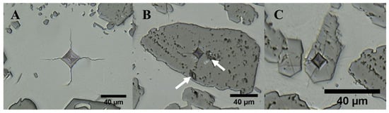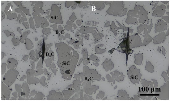 Figure 6 shows optical images of Vickers microhardness indentations (four-sided pyramid). Each phase of the composite was indented individually because the sizes of the indentations for the ASTM standard are not large enough to capture multiple phases at once. The indentation induced cracking in each phase. The hardness values for the matrix and two reinforcements are shown in Table 3. B4C was harder than SiC, and SiC was harder than the Si matrix material, which was expected [37]. The values of the particles were near the bulk values of the individual materials, even though there were some surface impurities or pores in the ceramic particles, as pointed out with the white arrows in Figure 6B.