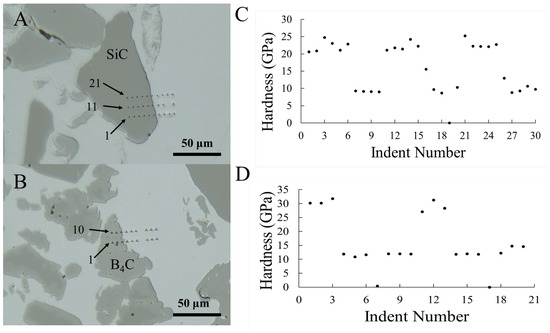Optical image of (A) the SiC-Si interface and (B) the B4C-Si interface revealing nanoindentation across particle–matrix interfaces: (A) indents across the SiC-Si interface with (C) corresponding indent hardness values, (B) indents across the B4C-Si interface with (D) corresponding indent hardness values of the B4C-Si interface.