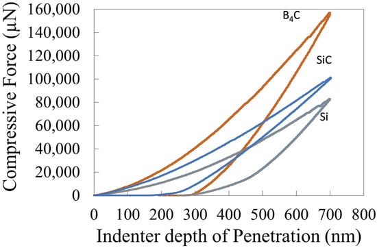 The force versus displacement of each phase was measured during nanoindentation to understand the material response. Figure 8 shows the force versus displacement data for each phase. Each phase requires a different force to experience the same amount of displacement, with B4C as the highest and Si as the lowest. Moreover, the slopes of the loading curves are different due to the stiffness differences between materials, and the hysteresis is very evident in the curves owing to the permanent plastic deformation. The force–displacement curves for each phase in Figure 8 show some pop-in behavior or discontinuities in the load, with a sudden drop in force around 600–700 nm, and this behavior is likely due to the nucleation of dislocations when the material experiences ample shear stress, as also shown in previous literature [38].