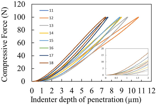 Indentation curves of compressive force versus indenter depth generated with the Zwick indentation system for the SiC-B4C-Si composites.