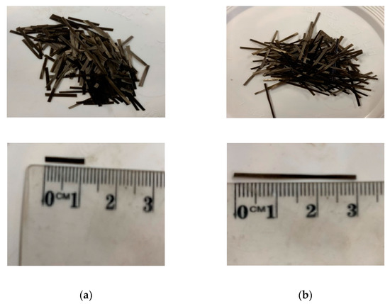 SCGC comprises fly ash/slag with a ratio of 60/40 and anhydrous sodium metasilicate powder (Na2SiO3) as an alkali-activator and 5% of micro ash is added to reduce the shrinkage and lowering voids and water demand. The water content is 45% of the binder weight [10]. Cement Australia Pty Ltd. supplied fly ash with a high silica ratio that met AS/NZS 3582.1:2016 standards [45]. Micro ash of 3.5 µm fine particle size was incorporated into the mix to increase workability and concrete strength [46,47]. Independent Cement and Lime Pty Ltd. and Redox Ltd. supplied the ground slag and the sodium anhydrous metasilicate powder (Na2SiO3), respectively. The chemical composition of SCGC’s binders is presented in Table 1. Additionally, 12 mm and 30 mm BFs, as illustrated in Figure 3, were added to reinforce the SCGC mixes, with 1%, 1.5% and 2% of binder weight. The physical properties of used BFs are detailed in Table 2. Heweidak et al. (2022) reported that SCGC mixes incorporating a 3:1 ratio of hybrid long-to-short BFs have better mechanical properties than mono-fibre systems. This study uses the same ratio (of 3:1) of long-to-short BFs to investigate the effect on the development of the SCGC’s drying shrinkage and plastic shrinkage cracks compared to mono-fibre systems.