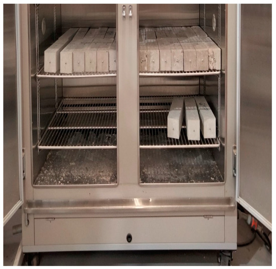 After taking the first measurement, the specimens were placed in the environmental chamber, as shown in Figure 7, under 23 °C temperature and 49% relative humidity. The environmental chamber was used to keep all specimens at room temperature throughout the curing process. The change variations of sample lengths were high in the early days after demolding, so they were recorded daily. Over time, measurements were taken after more extended periods as fewer length variations were observed.