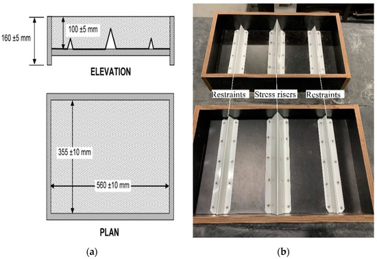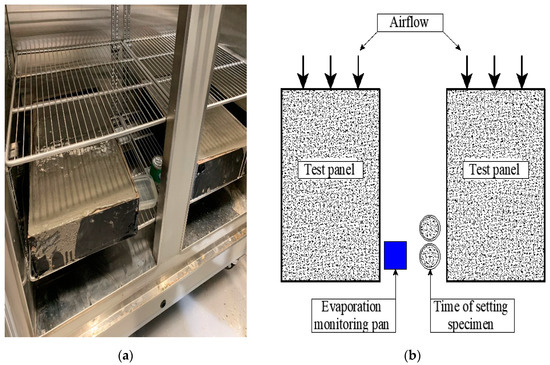 The plastic shrinkage mould was manufactured using timber plywood following the ASTM C1579-06 standards [54]. As indicated in Figure 8, the mould dimensions are 560 mm (length) × 355 mm (width) × 100 mm (height). Two restraints of 32 ± 1 mm height were placed 90 ± 10 mm inward from both ends of the mould. A stress riser of 63.5 ± 1 mm was placed at the mould’s centre, as shown in Figure 8. According to ASTM C1579-06 standards [54], a minimum 1 kg/(h·m2) evaporation rate from the water surface is required to cause a crack. The standard test set a temperature, relative humidity, and wind speed of 36 ± 3 °C, 30 ± 10% and 4.7 m/s, respectively, to achieve the minimum required evaporation rate. However, a temperature of 55 °C and relative humidity of 20% was needed for a minimum evaporation rate of 1 kg/(h·m2). As shown in Figure 9, an environmental chamber was used to stimulate the required environmental conditions. The weight of each panel was measured on the scale and then placed on the bottom shelf of the humidity chamber, as shown in Figure 10a, to ensure continuous exposure to the uniformly circulated flowing air and, consequently, a higher evaporation rate from the concrete surface. Moulds to determine the final setting time were placed beside the panels in the humidity chamber. Figure 10b presents a schematic plan of the chamber contents.